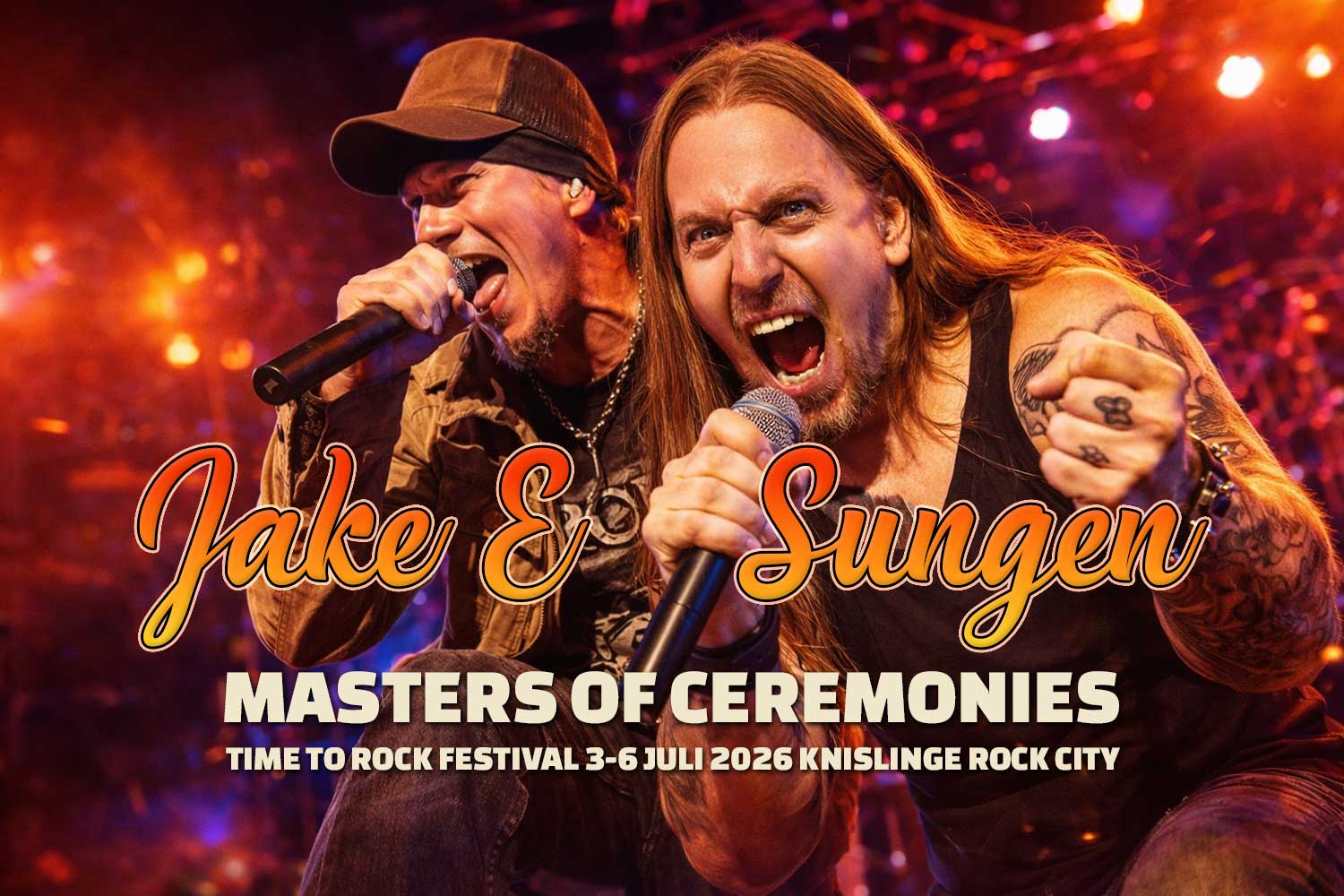 sj.jpgSo it was time to introduce our emcees who will deliver info from the stages during Time To Rock 2026. SUNGEN is jumping on this job again after being banished to a corner in our VIP last year. He has been nagging and nagging and sending a lot of letters, faxes and shady videos and asking us to let him be emcee again and in the end we gave in. His nagging became too much. However, we forced him to not be alone and that he should bring someone with more knowledge, more intelligence and more charm. The choice then fell on JAKE E. Yes, you know, the awesome singer in Cyhra, who was also the singer in Amaranthe. He seems to have a lot more insight into things than Sungen, we thought. Yes, then we got to see the video you can see on our Facebook page...so help us God.